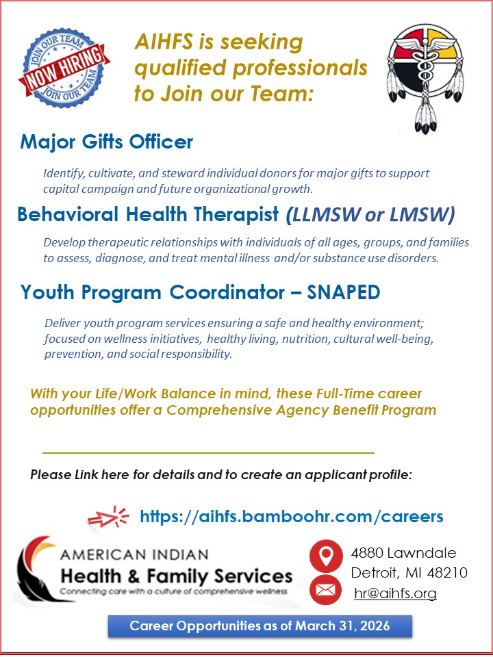 American Indian Health and Family Services of Southeastern Michigan, Inc. is an equal opportunity employer committed to a diverse, multicultural work environment. Preference in hiring is given to qualified Native Americans in accordance within the scope of the Indian Preference Act (Title 25, US Code); all applicants will receive equal consideration. All potential hires are subject to a criminal background investigation and must pass drug and alcohol testing upon employment and random testing during the course of employment. Reasonable accommodations will be made to enable individuals with disabilities to perform the essential functions.